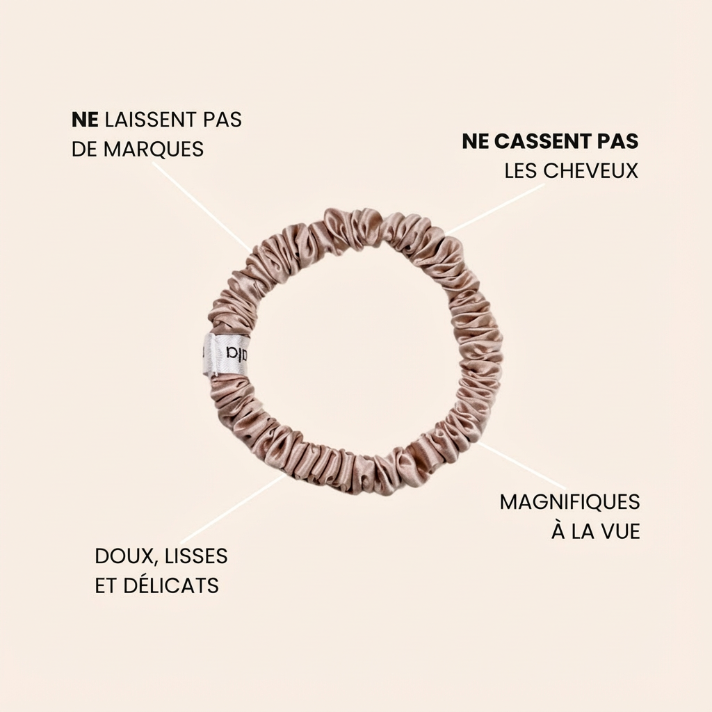 Offrez à vos cheveux une expérience luxueuse. Nos chouchous en soie minimisent la casse, ne laissent pas de marques et sont tellement confortables qu’on oublie qu’on les porte. Tout en offrant une bonne tenue, ils sont doux et délicats, répartissent la pression de manière uniforme et glissent en douceur sur les cheveux. Ils sont aussi magnifiques visuellement ! Une excellente idée cadeau pour vous ou pour un proche.